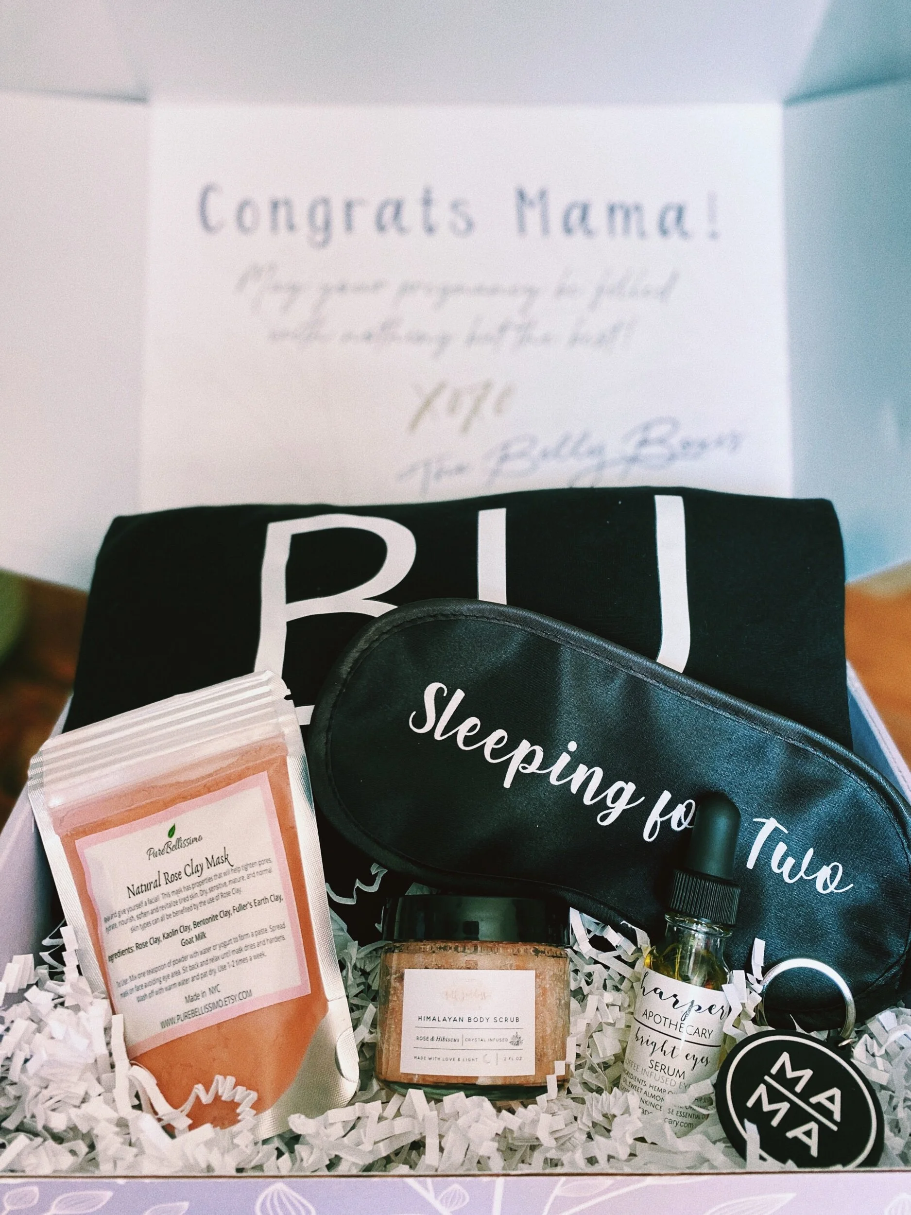 My Belly Box came with a natural rose clay mask, rose and hibiscus himalayan body scrub, coffee infused eye serum, bump shirt, eye mask and keychain. Loving it all.