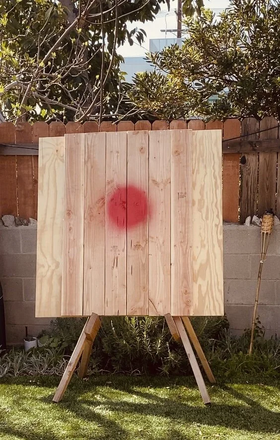 We wanted to come up with a unique way to find out the gender. Axe throwing is something we love to do when we go camping so Levi made an axe throwing target for our gender reveal which was lots of fun. He made the axe board out of pine wood because it’s softer than most wood which makes it easier to get the axe to stick. He nailed the pine wood to a sheet of plywood. I had my friend Carlie get the black balloon and filled it with pink powder and then nailed it to the bulls eye of the board. I had Levi throw the axe because during practice I kept missing and plus he is good at axe throwing:-). He threw the axe and I, along with 6 others popped pink powder poppers. It was amazing! Finding out we were having a girl made us feel so overjoyed!